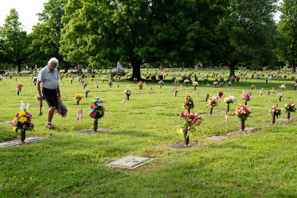 An attendee sprinkles tobacco on the side of one of the mounds at the signing of the conservation easement to protect the Glass Mounds historic Indigenous site at Westhaven Golf Club on Monday, Oct. 9, Indigenous Peoples’ Day, 2023.