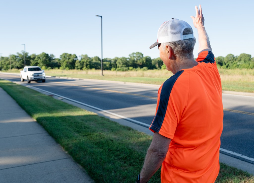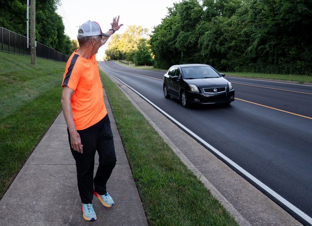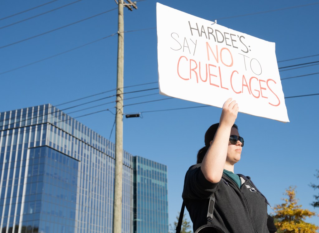 Jones holds a sign facing traffic during a protest by Humane League Activists at the headquarters of CKE in Franklin on Thursday, Oct. 17, 2024.