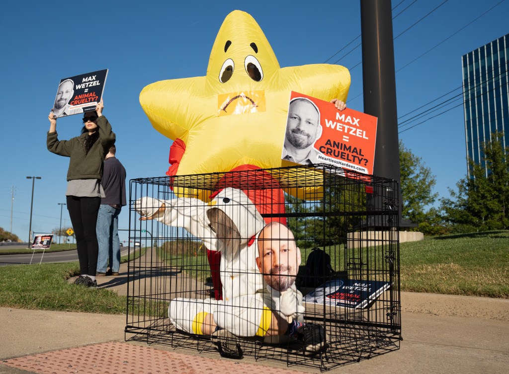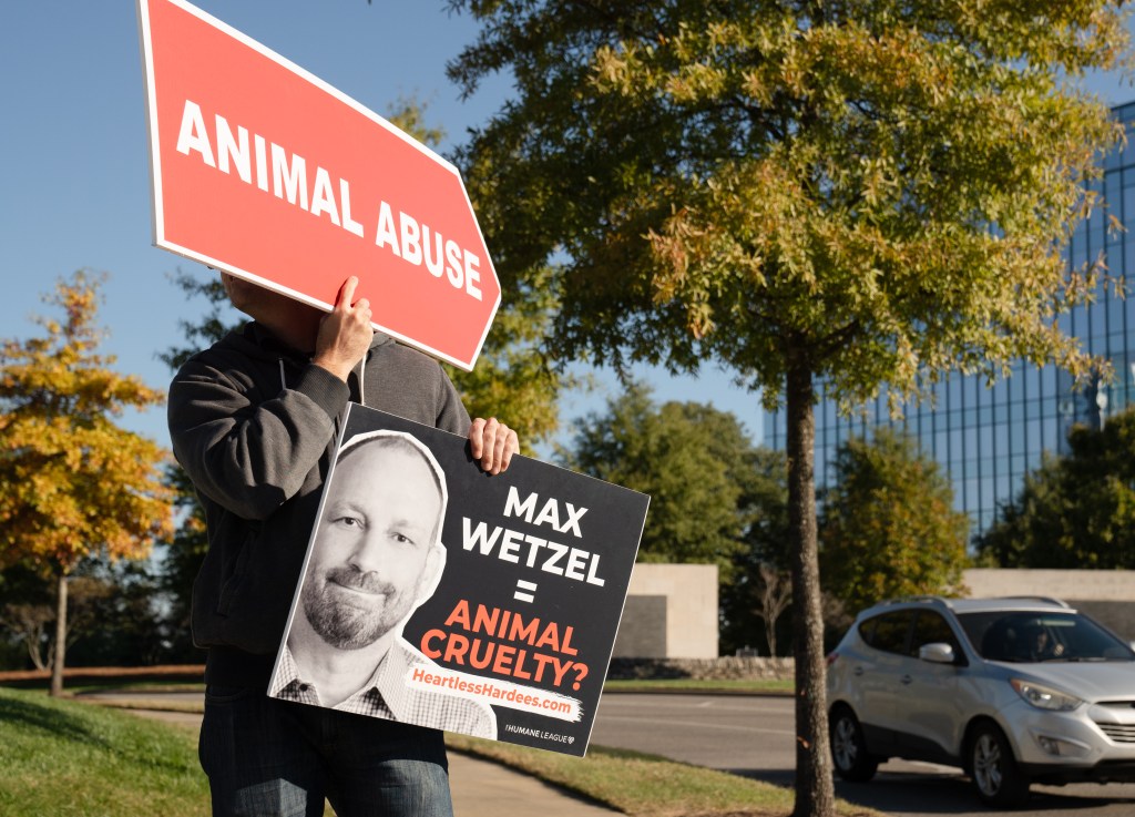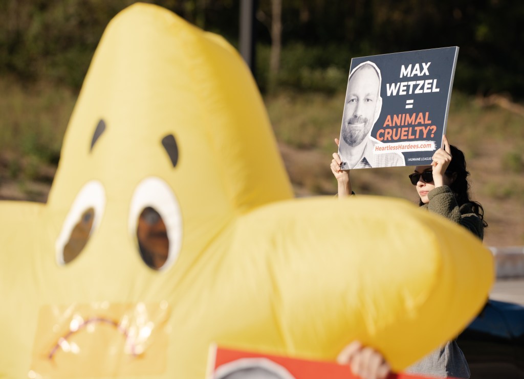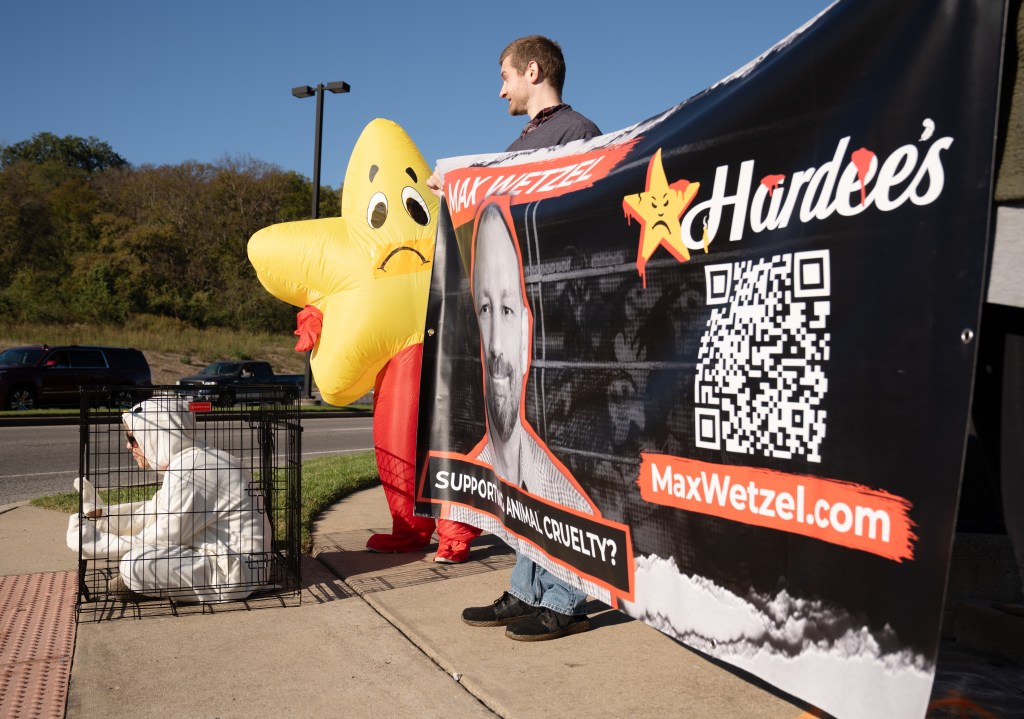 Humane League Activists hold a banner up during a protest at the headquarters of CKE in Franklin on Thursday, Oct. 17, 2024.