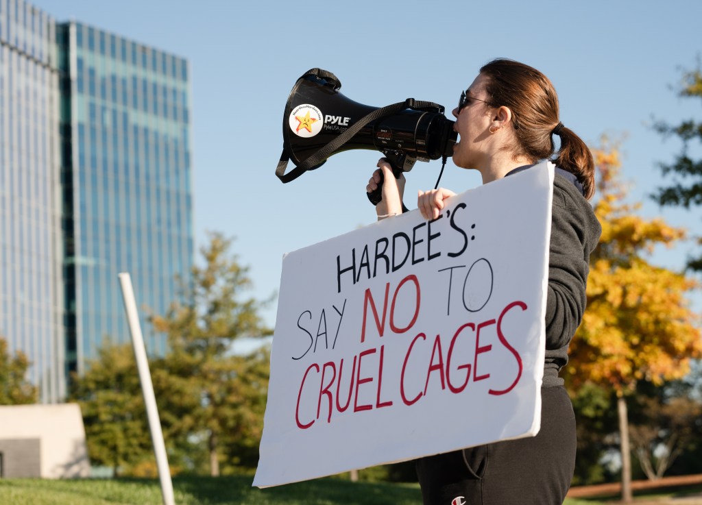 Marissa Garst holds a sign towards the headquarters of CKE during a protest by Humane League Activists on Thursday, Oct. 17, 2024.
