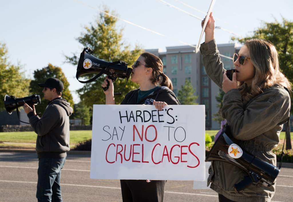 Activists with the Humane League protest at the headquarters of CKE in Franklin on Thursday, Oct. 17, 2024.