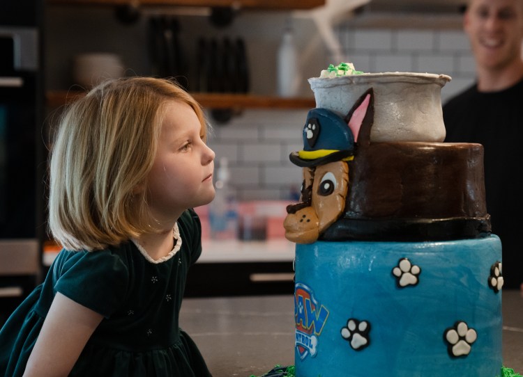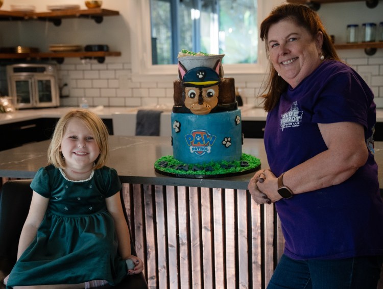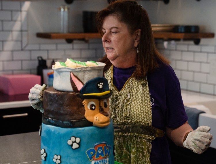 Icing Smiles baker Joan Vaughn finishes a “Paw Patrol” themed cake for 5 year-old Elliana Richardson at the Richardsons’ house in Franklin on Friday, Nov. 1, 2024.
