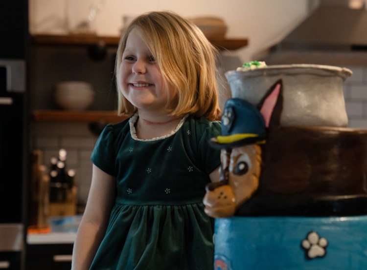 Elliana Richardson poses for a photo with her “Paw Patrol” themed birthday cake at the Richardsons’ house in Franklin on Friday, Nov. 1, 2024.