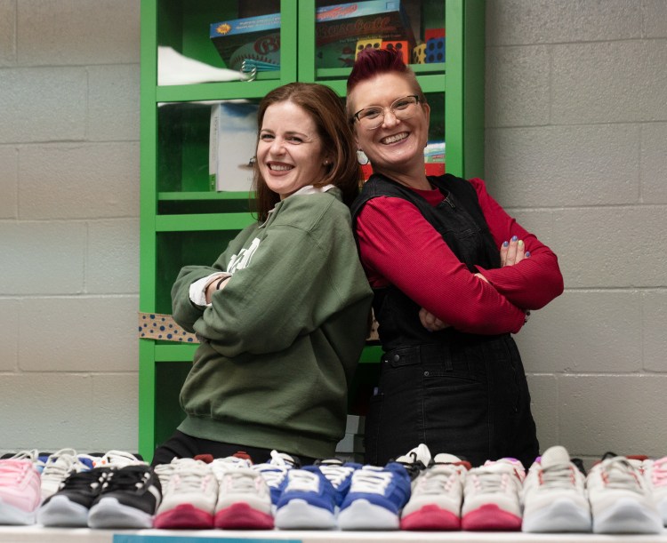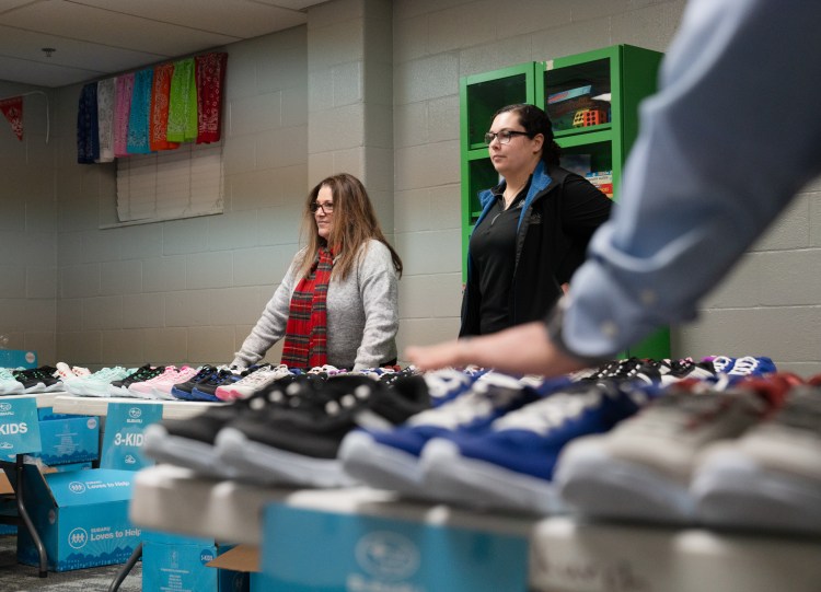 Lisa Pierson (left) and Charlotte Blackwell (right) preper to hand out shoes at a collaborative event between Subaru Waltrip, Operation Warm, Graceworks and Franktown Open Hearts to give shoes to local children in need on Tuesday, Jan. 14, 2025.