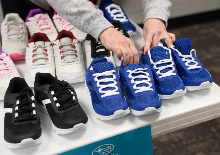 A volunteer sets out more shoes at a collaborative event between Subaru Waltrip, Operation Warm, Graceworks and Franktown Open Hearts to give shoes to local children in need on Tuesday, Jan. 14, 2025.