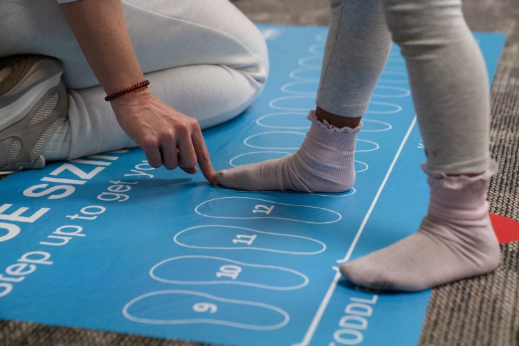 A volunteer helpes a child find tehir shoe size at a collaborative event between Subaru Waltrip, Operation Warm, Graceworks and Franktown Open Hearts to give shoes to local children in need on Tuesday, Jan. 14, 2025.