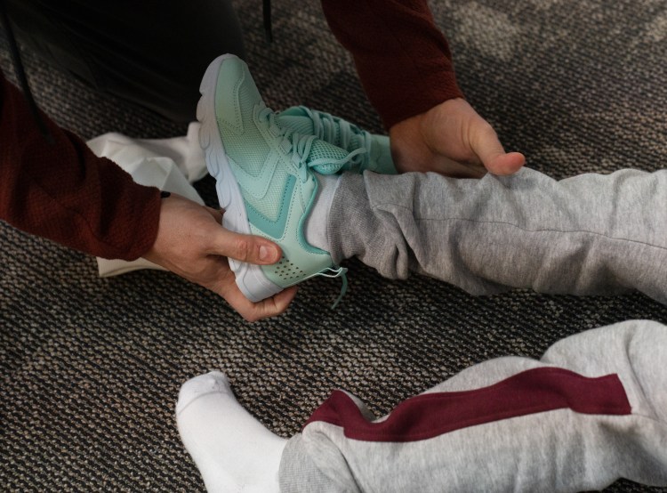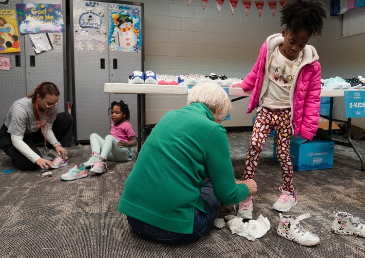 Volunteers fit students with shoes at a collaborative event between Subaru Waltrip, Operation Warm, Graceworks and Franktown Open Hearts to give shoes to local children in need on Tuesday, Jan. 14, 2025.