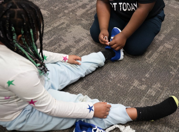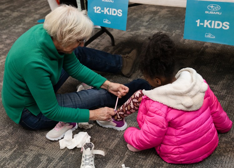 A volunteer ties a child’s shoe at a collaborative event between Subaru Waltrip, Operation Warm, Graceworks and Franktown Open Hearts to give shoes to local children in need on Tuesday, Jan. 14, 2025.
