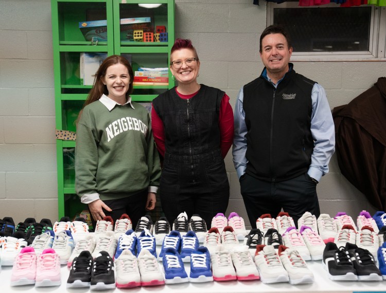 Alicia Bell, Nicole McIntyre and Jimmy Harris pose for a photo at a collaborative event between Subaru Waltrip, Operation Warm, Graceworks and Franktown Open Hearts to give shoes to local children in need on Tuesday, Jan. 14, 2025.